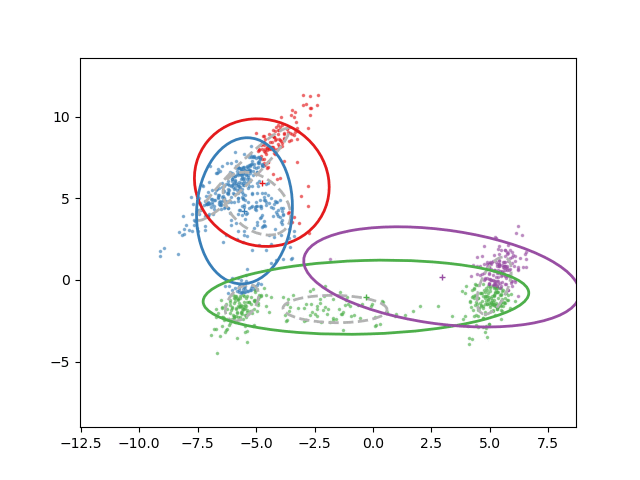 fullsphericaldiagtied means all components share the same covariance matrixmax_iter is EM iterations to useM.fit(X) fits using the EM algorithmM.predict_proba(X) is the posterior probability of each component given the dataM.predict(X) predict the class labels of each data point