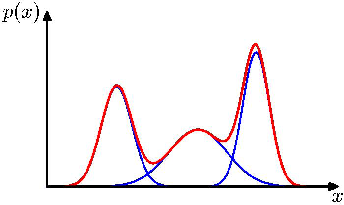 \[p(\mathbf{x}) = \sum_{k=1}^K \pi_k \mathcal{N} (\mathbf{x} | \boldsymbol{\mu}_k, \mathbf{\Sigma}_k)\]