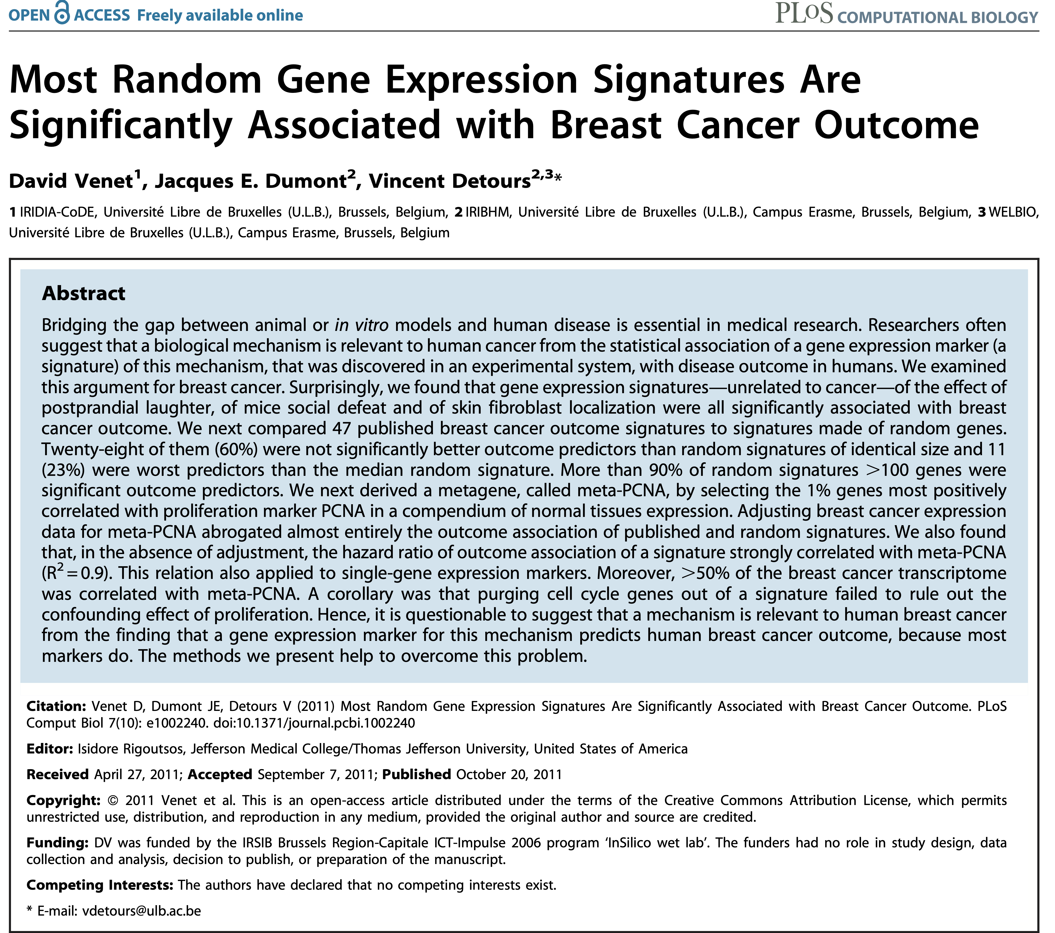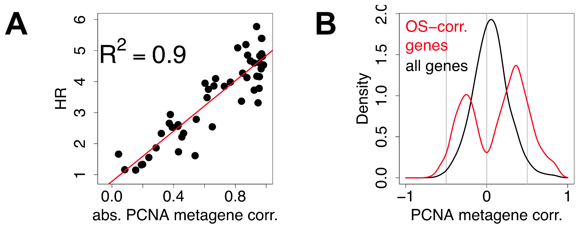 Figure 4. Most prognostic transcriptional signals are correlated with meta-PCNA. A) Each point denotes a signature. The x-axis depicts the absolute value of the correlation of the first principal component of the signatures with meta-PCNA, the y-axis depicts the hazard ratio for outcome association. Details of the analysis for each data point are available in the Supporting Information (Text S1). B) Distribution of the correlations of individual genes with meta-PCNA, for genes significantly associated with overall survival (red) and for all the genes spotted on the microarrays (black).