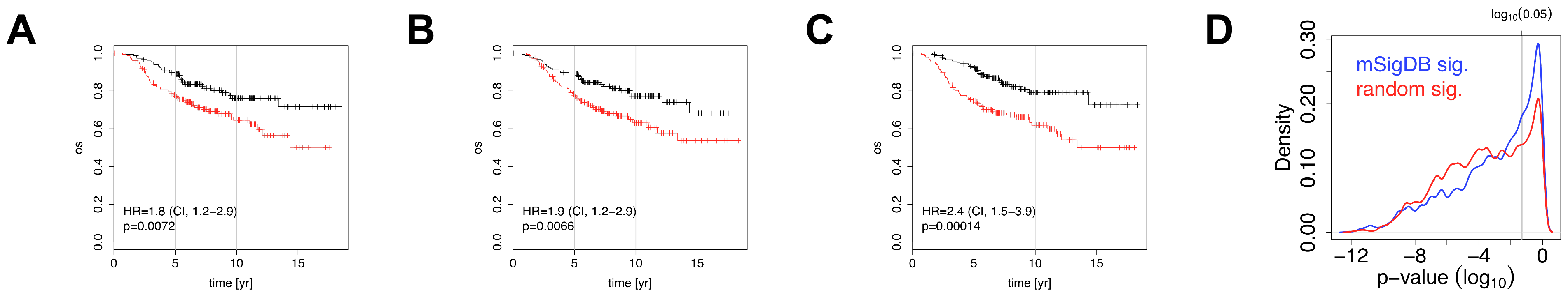 Figure 1. Association of negative control signatures with overall survival. In plots A-C the NKI cohort was split into two groups using a signature of post-prandial laughter (panel A), localization of skin fibroblasts (panel B), social defeat in mice (panel C). In panels A-C, the fraction of patients alive (overall survival, OS) is shown as a function of time for both groups. Hazard ratios (HR) between groups and their associated p-values are given in bottom-left corners. Panel D depicts p-values for association with outcome for all MSigDB c2 signatures and random signatures of identical size as MSigDB c2 signatures.