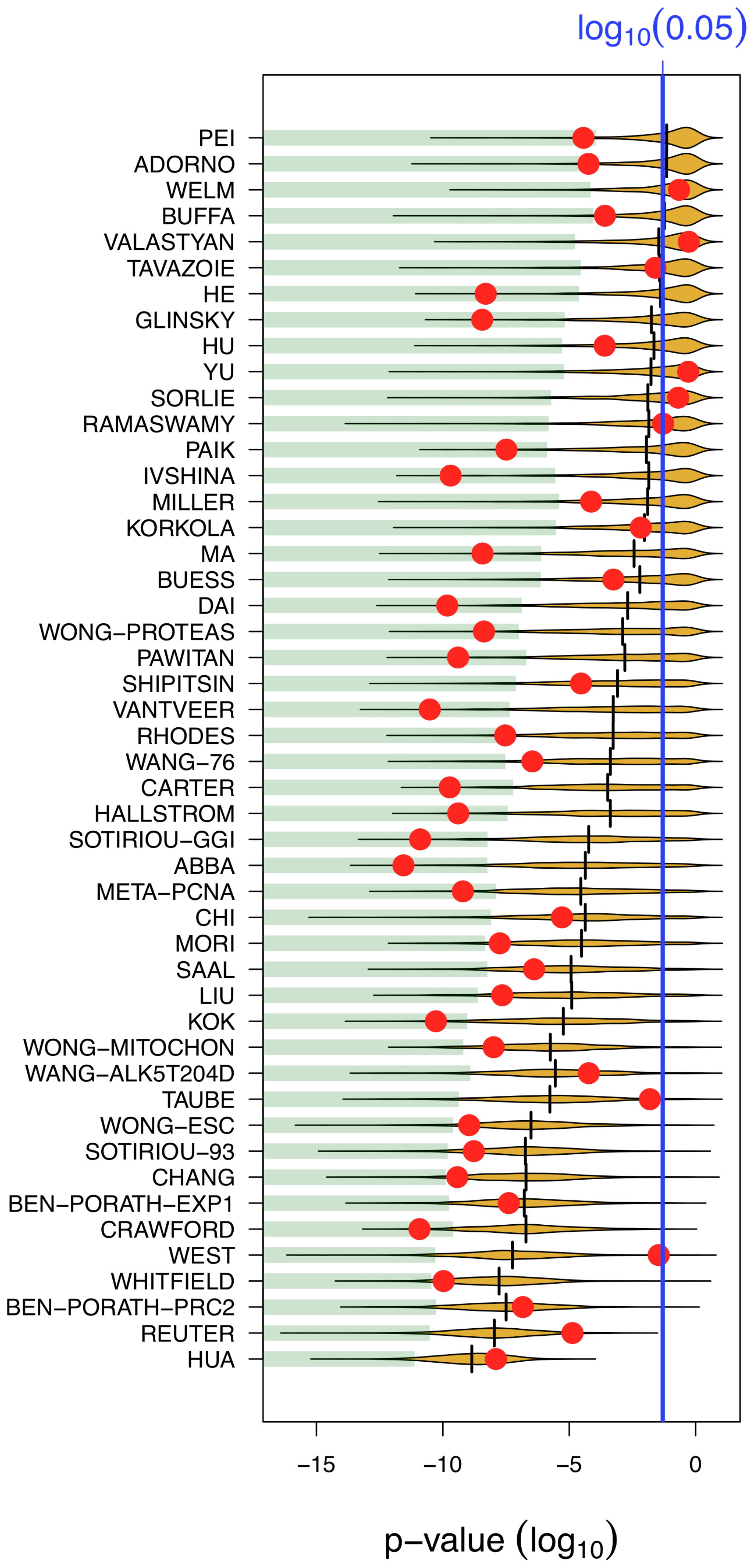 Figure 2. Most published signatures are not significantly better outcome predictors than random signatures of identical size. The x-axis denotes the p-value of association with overall survival. Red dots stand for published signatures, yellow shapes depict the distribution of p-values for 1000 random signatures of identical size, with the lower 5% quantiles shaded in green and the median shown as black line. Signatures are ordered by increasing sizes.