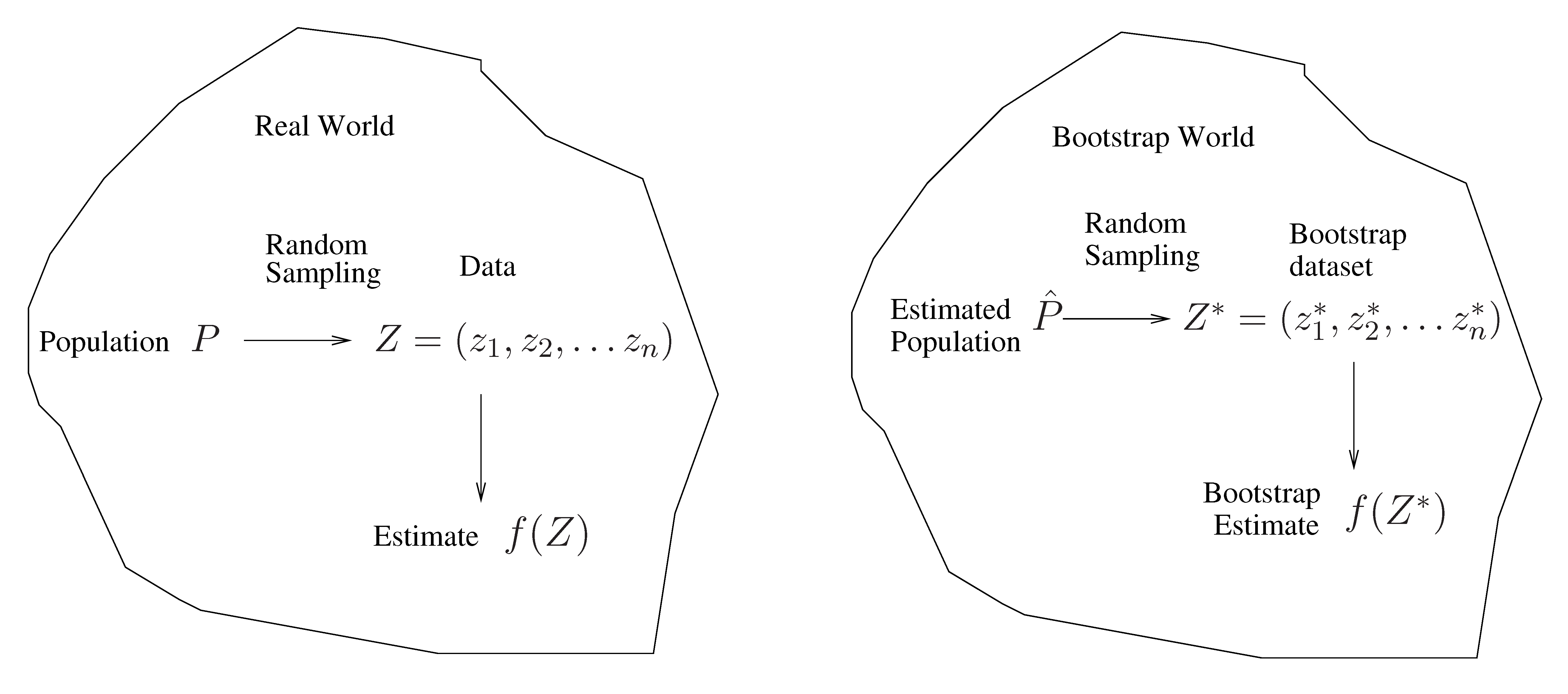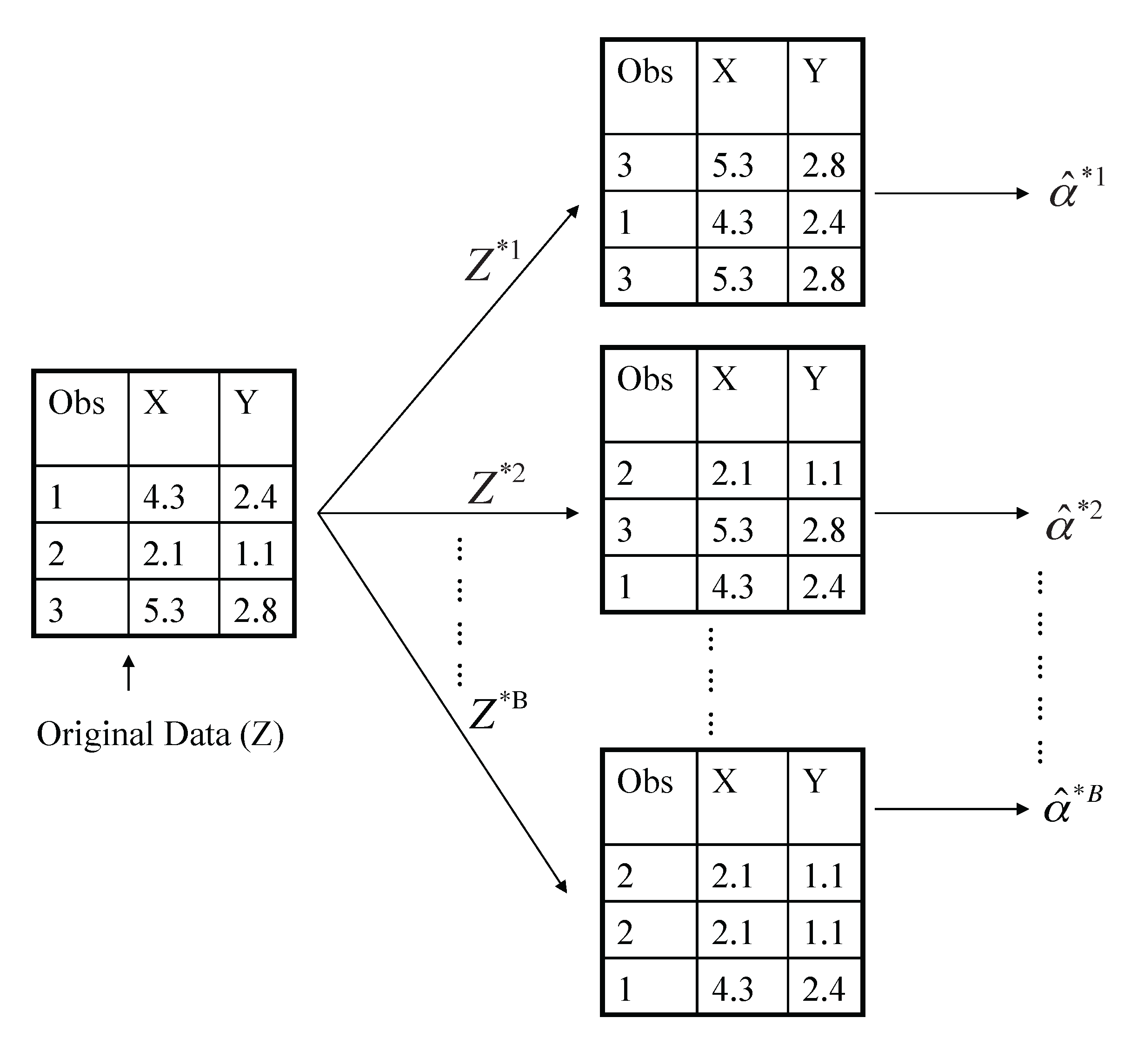 A graphical illustration of the bootstrap approach on a small sample containing \(n = 3\) observations. Each bootstrap data set contains \(n\) observations, sampled with replacement from the original data set. Each bootstrap data set is used to obtain an estimate of \(\alpha\).